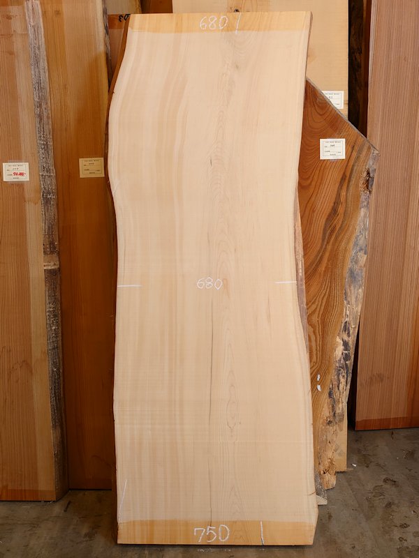 桧の幅広耳付き板です。長さ2000、木表幅680~750、木裏幅730~790、厚み75。 天然乾燥材、反りほぼなし、節あり、オモテ面上下とも木口割れ10センチほどあり。裏面には節割れあります。オモテ面の黒いスジはカスリですので、割れではありません。 裏面厚みが少し薄い部分があります。 仕上げ加工前ですので表面ザラザラの状態です。 詳細画像や詳細寸法がご希望の場合、また表面仕上げ加工やテーブル、看板製作をご希望の場合はお問い合わせよりご連絡いただけましたらお見積りさせていただきます。