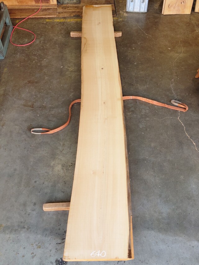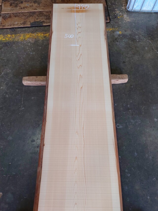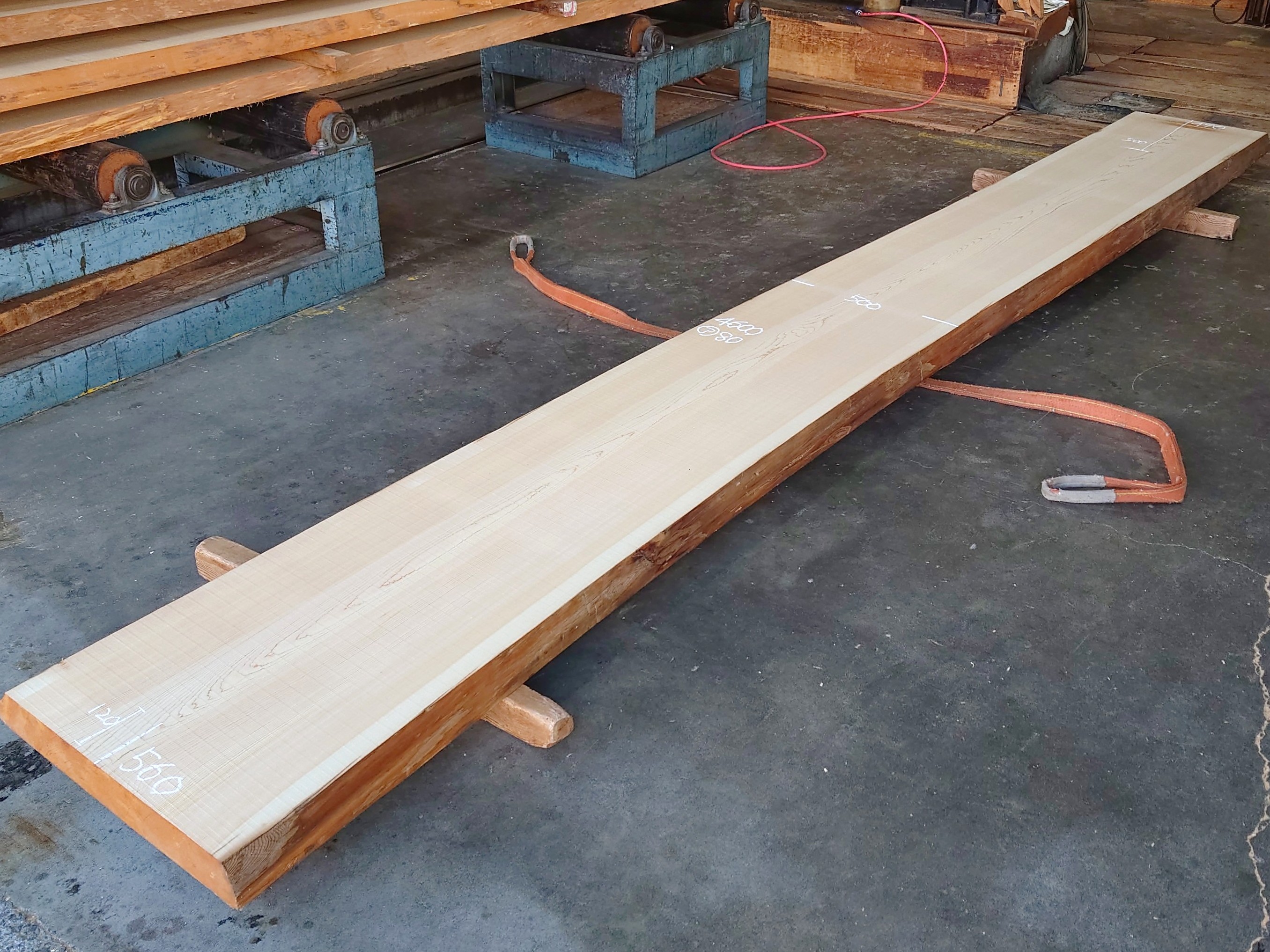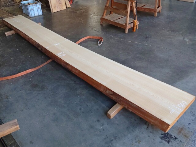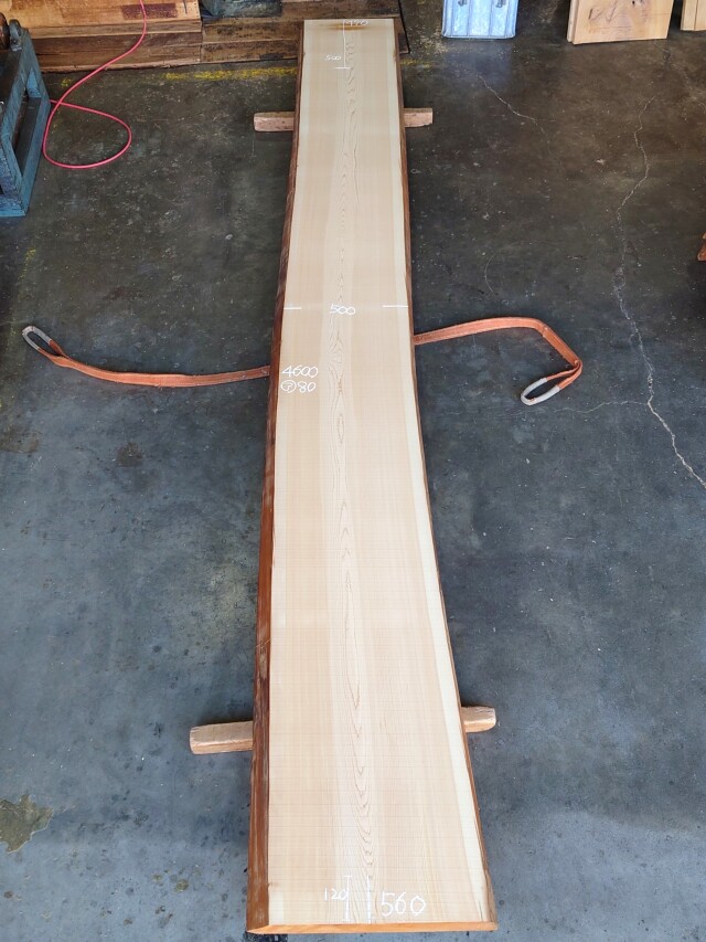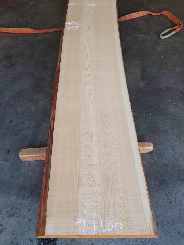 【長さ】4600、【木表幅】490~500~560、【木裏幅】540~640、【厚み】80。