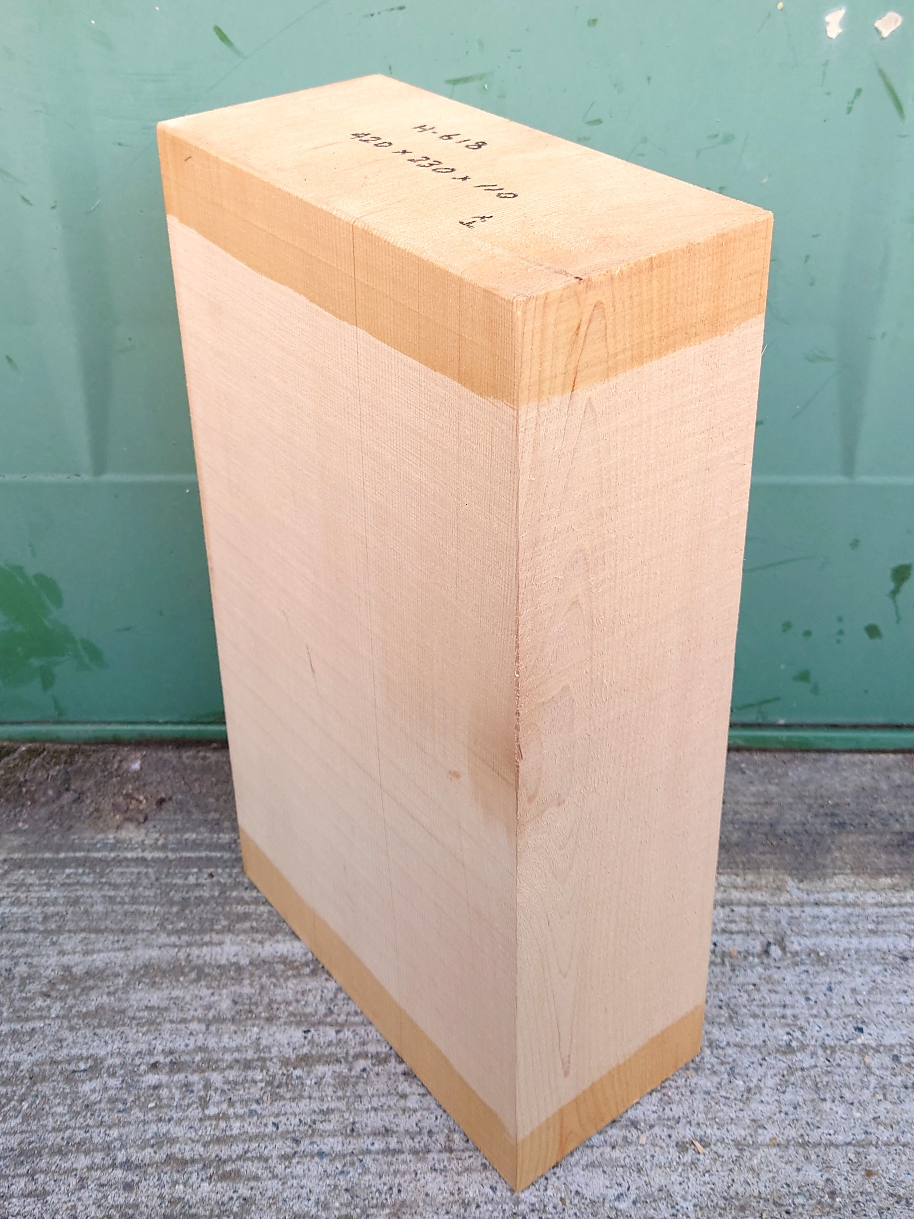 木曽桧の目の細かい良材柾目の彫刻用材です。【長さ】420、【幅】230、【厚み】110。