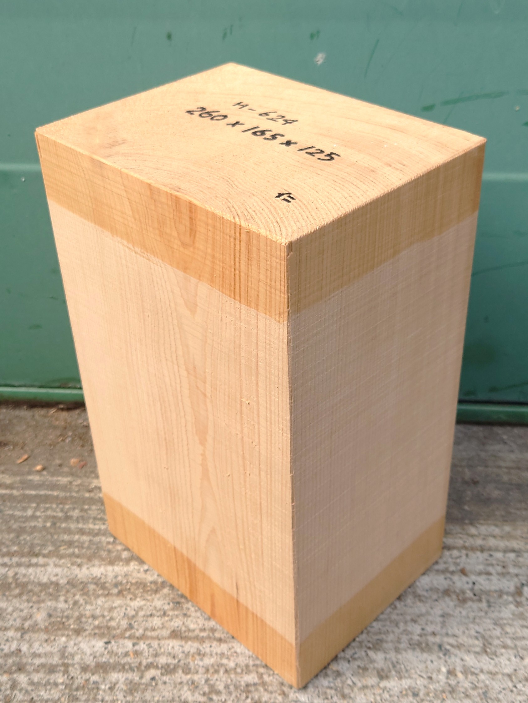 木曽桧の目の細かい良材の彫刻用材です。【長さ】260、【幅】165、【厚み】125。 【天然乾燥材】、【反り】なし、【節】なし、【割れ】なし。 木口面に割れ止めが塗ってあります。削れば取れます。
