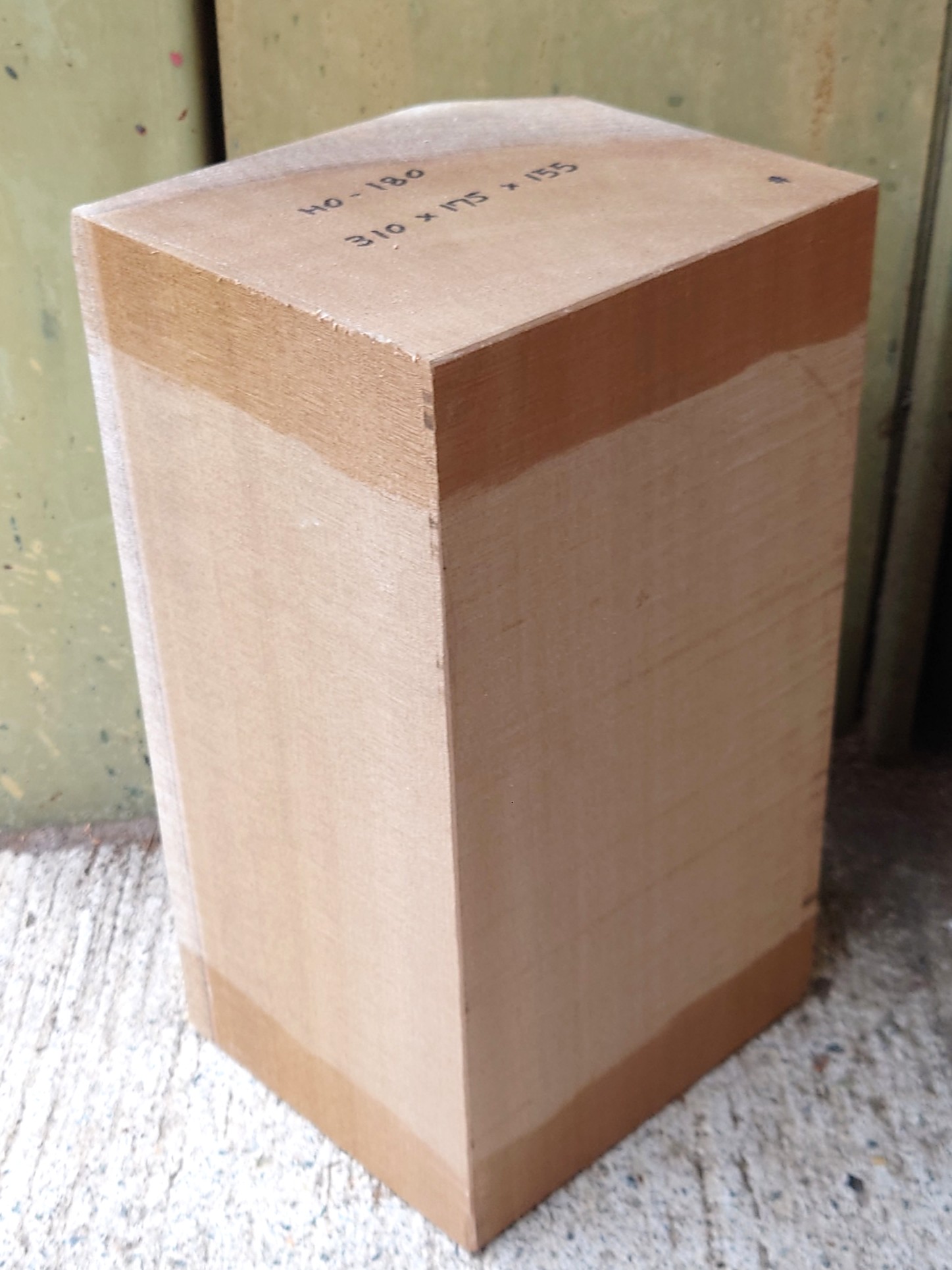 希少な彫刻材、国産の朴ホウノキです。【長さ】310、【幅】175、【厚み】155。 【天然乾燥材】、【節】なし、【反り】なし、【割れ】なし。丸み部分に小さい割れあります。 木口面に割れどめが塗ってあります。削れば取れます。