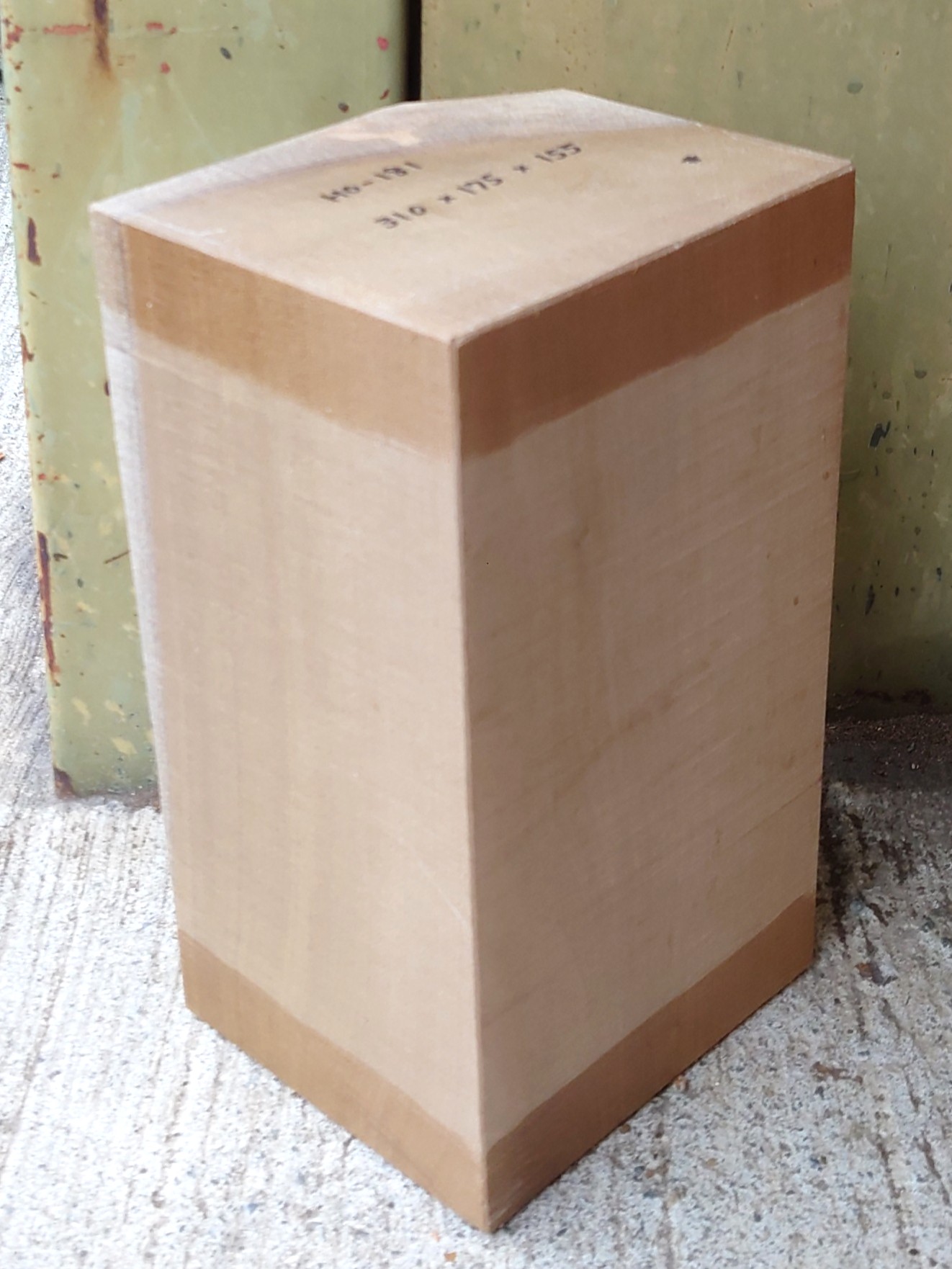 希少な彫刻材、国産の朴ホウノキです。【長さ】310、【幅】175、【厚み】155。 【天然乾燥材】、【節】なし、【反り】なし、【割れ】なし。丸み部分に小さい割れあります。 木口面に割れどめが塗ってあります。削れば取れます。