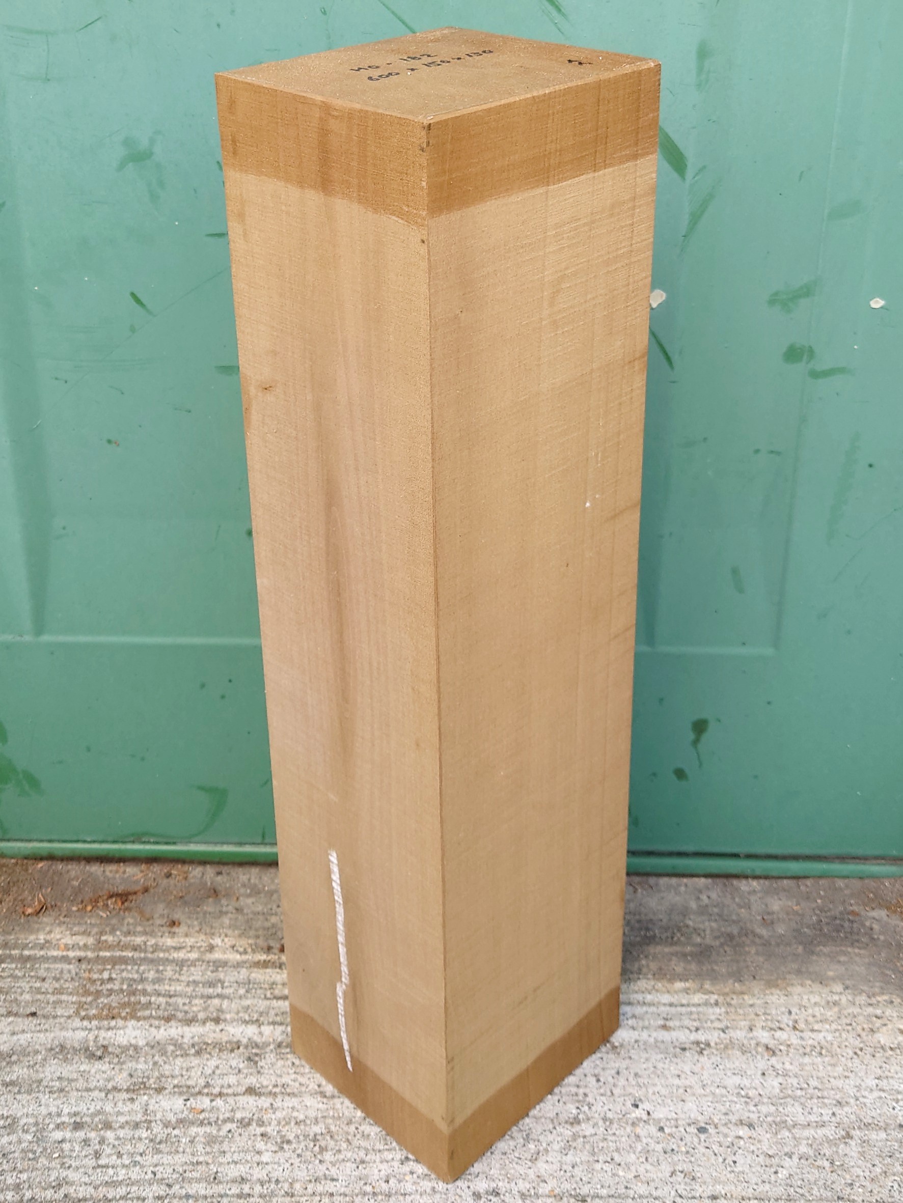 希少な彫刻材、国産の朴ホウノキです。【長さ】600、【幅】150、【厚み】130。 【天然乾燥材】、【節】なし、【反り】なし、【割れ】なし。下部白チョーク小さい割れあり。 木口面に割れどめが塗ってあります。削れば取れます。
