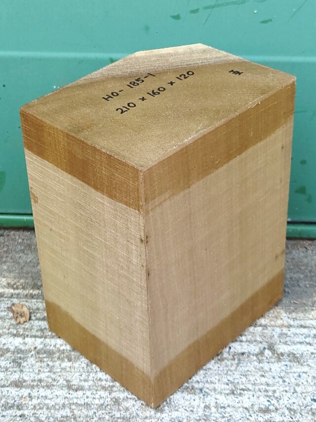 希少な彫刻材、国産の朴ホウノキです。【長さ】210、【幅】160、【厚み】120。お写真と同等品(同じ木の別の部分)になります。 【天然乾燥材】、【節】なし、【反り】なし、【割れ】なし。丸み部分に小さい割れあります。 木口面に割れどめが塗ってあります。削れば取れます。