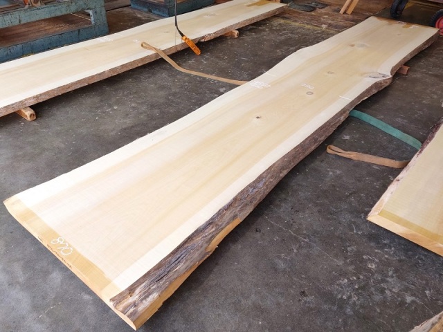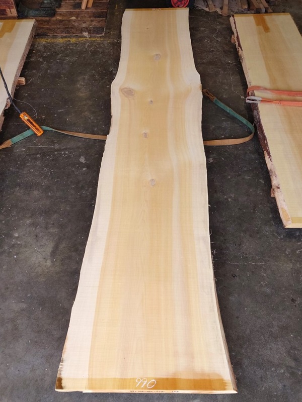 きれいなイチョウの耳付き板です。カウンターに最適です。【長さ】4550、【木表幅】770~790~870、【木裏幅】810~990、【厚み】60。 【天然乾燥材】、【反り】ほとんどなし、【節】あり、【割れ】上180ミリ小口割れあり。 表面は製材のままですのでザラザラです。詳細画像や詳細寸法がご希望の場合、また表面仕上げ加工やテーブル、看板製作をご希望の場合はお問い合わせよりご連絡いただけましたらお見積りさせていただきます。