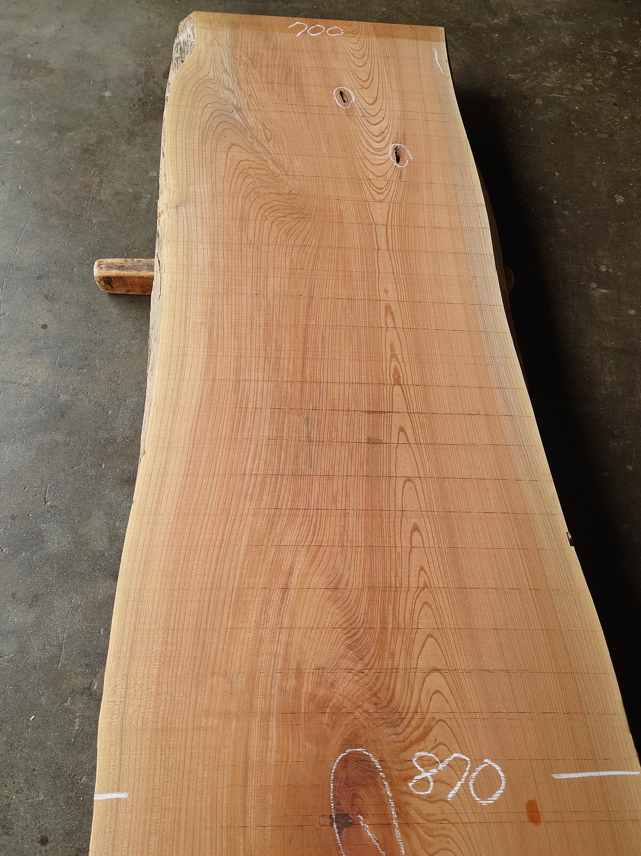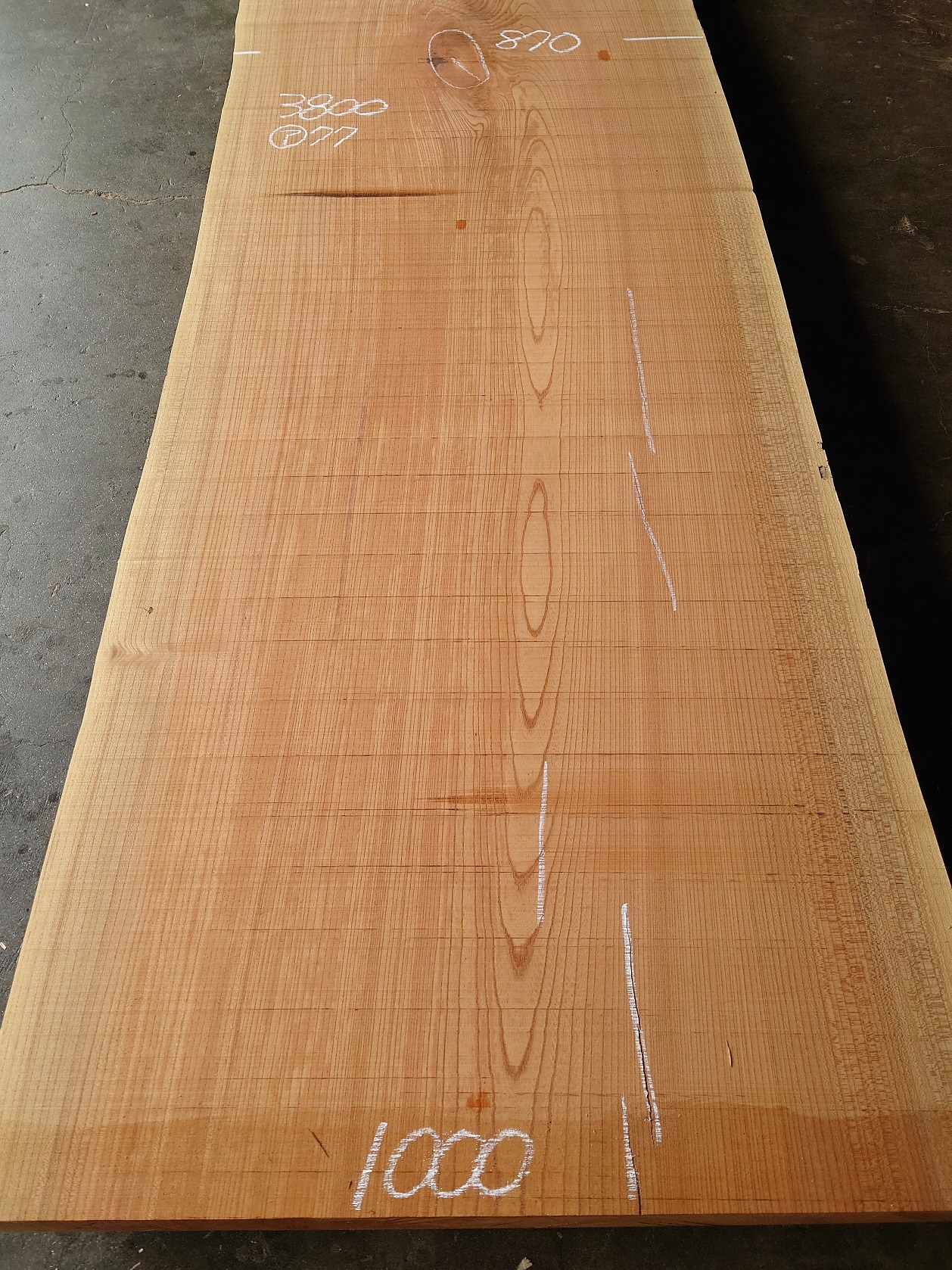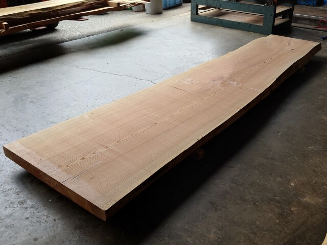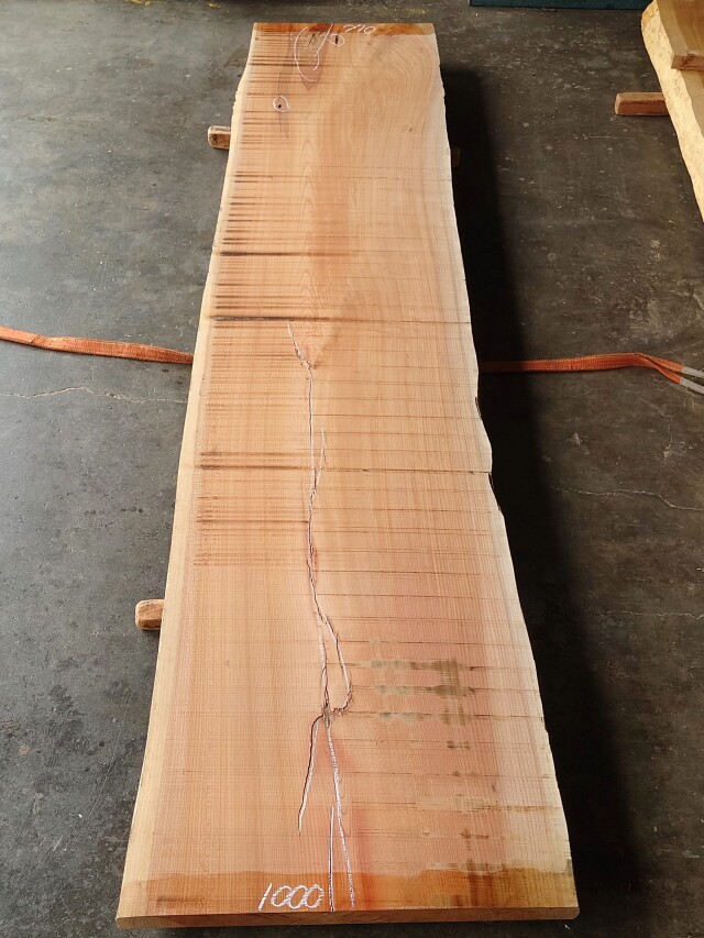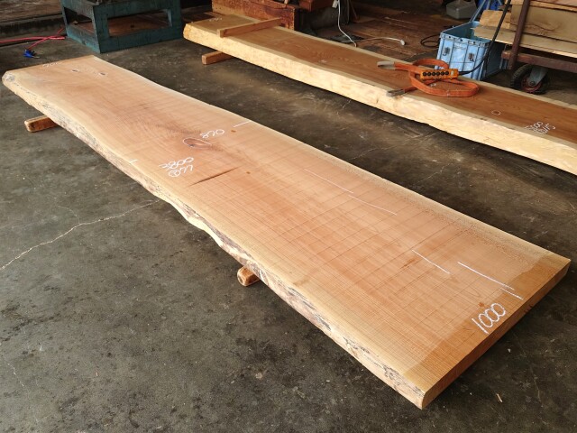 【長さ】3800、【木表幅】700~870~1000、【木裏幅】770~1000、【厚み】77。