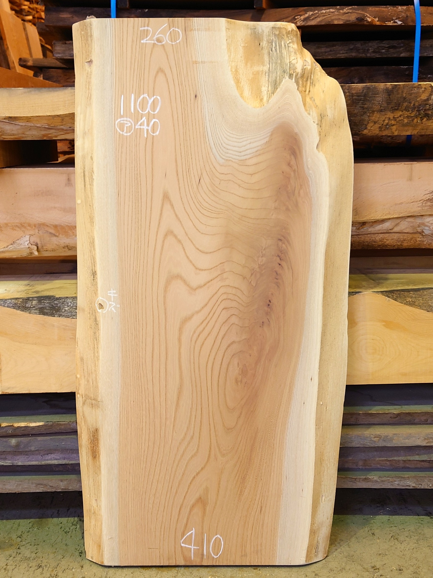 【長さ】1100、【木表幅】260~410、【木裏幅】450~500、【厚み】40。
