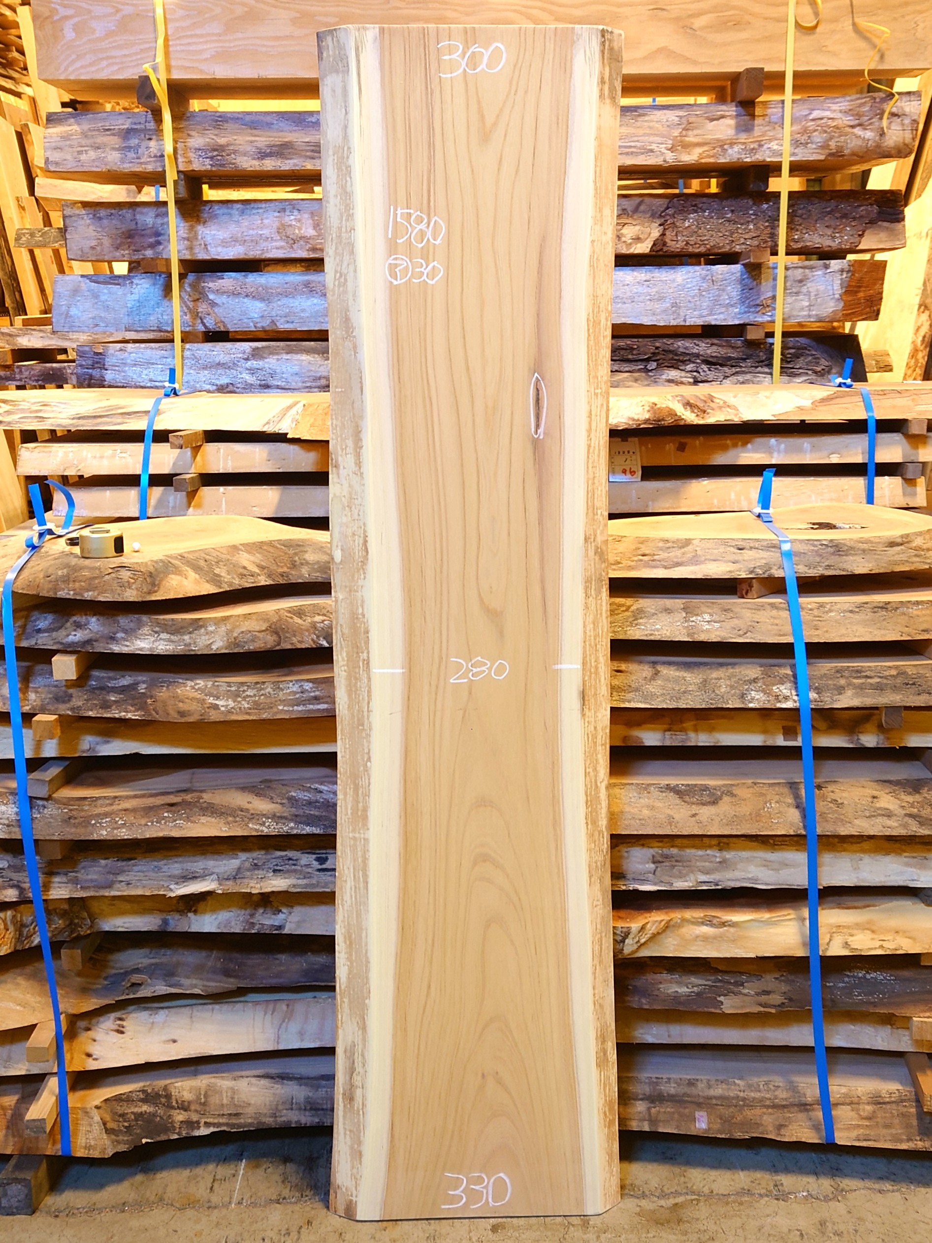 【長さ】1580、【木表幅】300~320~330、【木裏幅】380~410、【厚み】30。