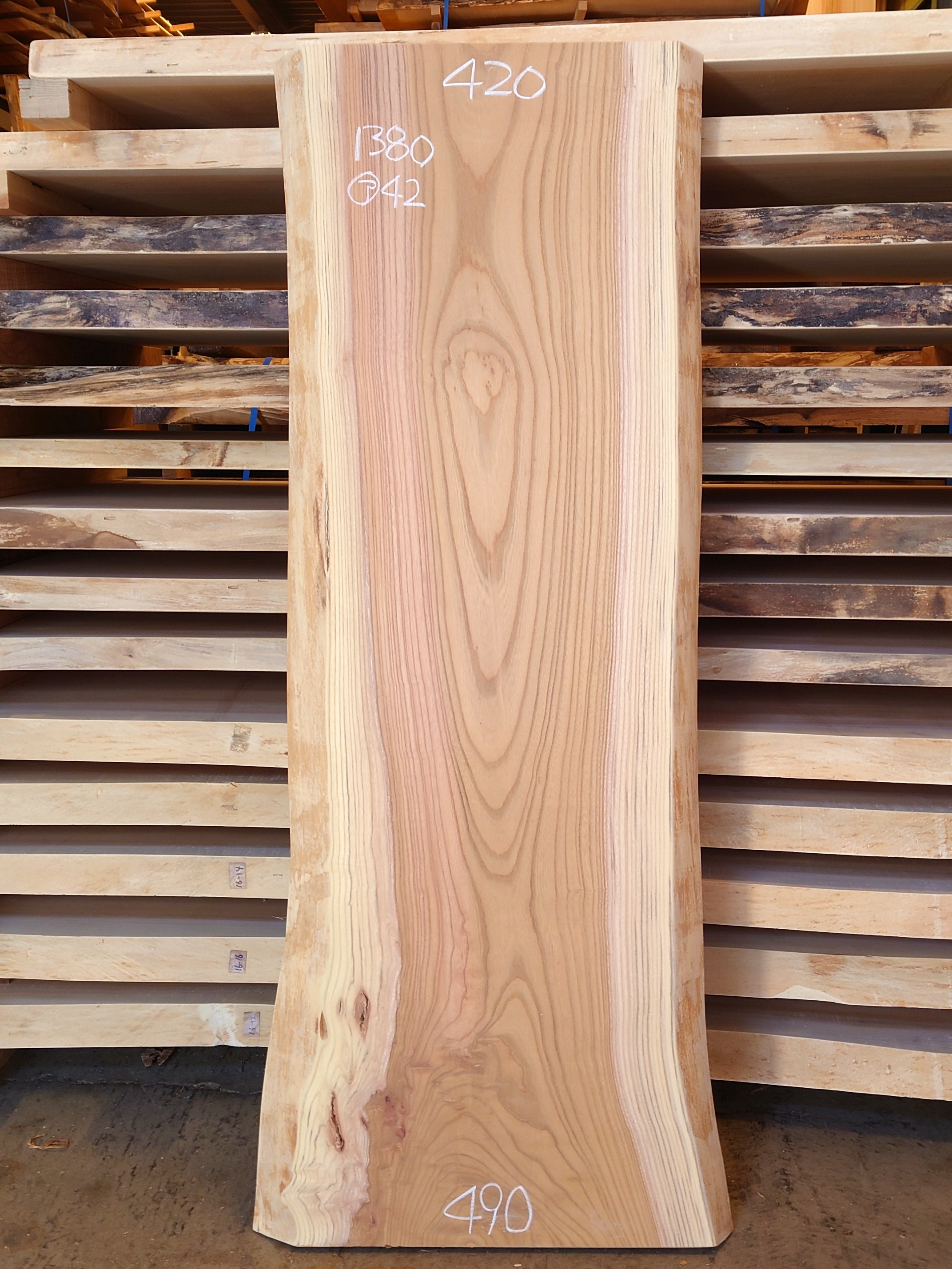 【長さ】1380、【木表幅】420~490、【木裏幅】490~570、【厚み】42。