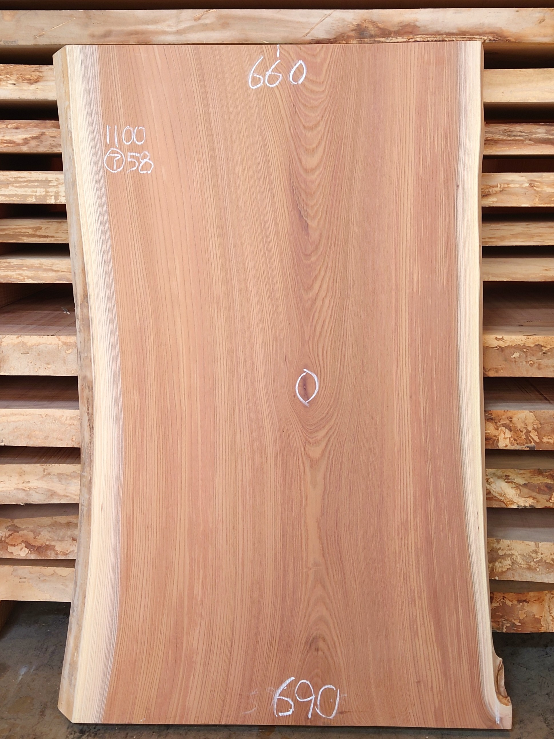 【長さ】1100、【木表幅】660~690、【木裏幅】710~760、【厚み】58。