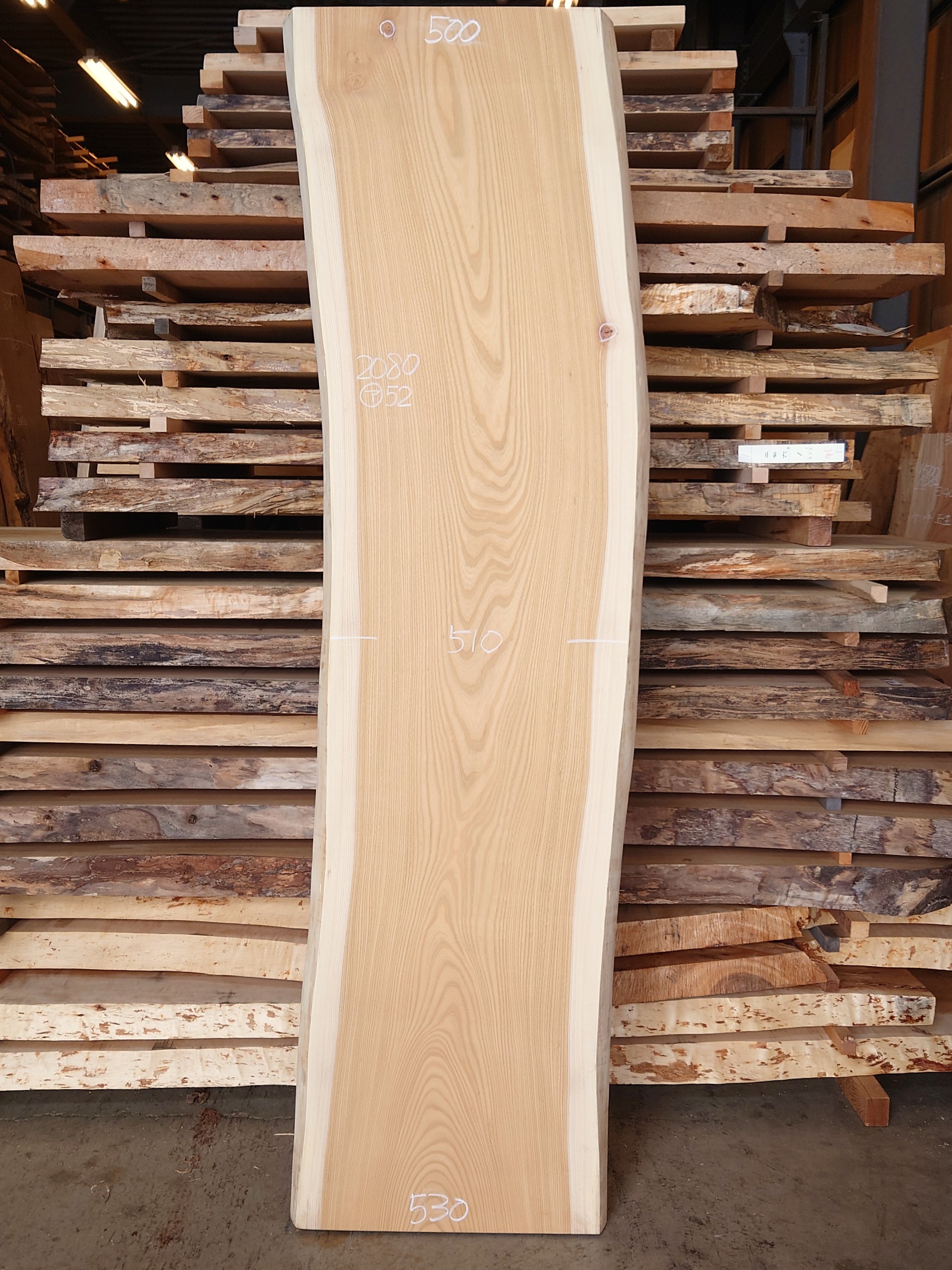 【長さ】2080、【木表幅】500~510~530、【木裏幅】560~560、【厚み】52。(厚み均一ではありません)