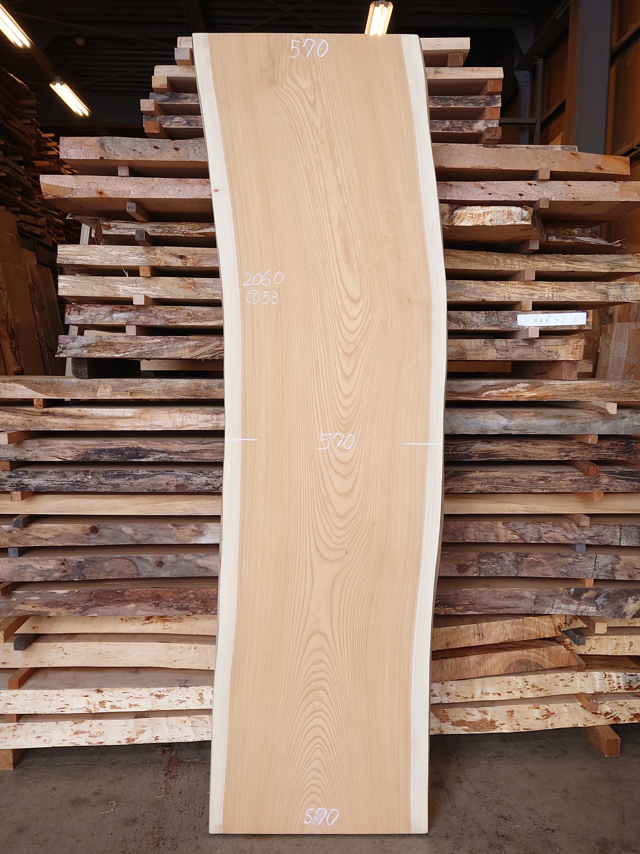 【長さ】2060、【木表幅】570~570、【木裏幅】590~580、【厚み】53。(厚み均一ではありません)