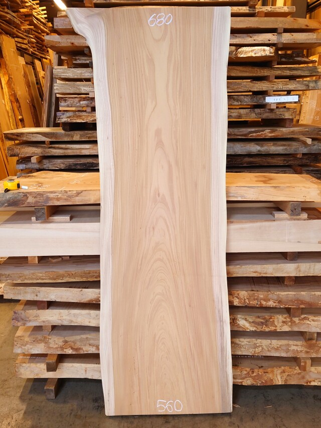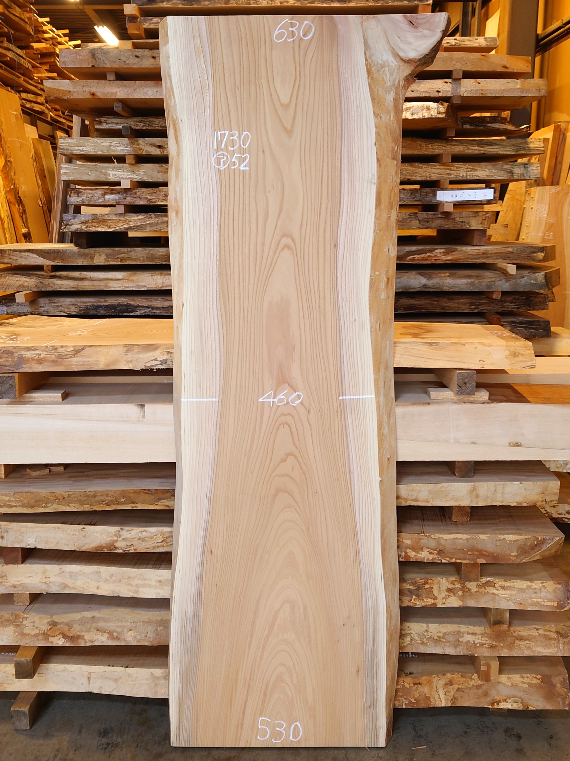 【長さ】1730、【木表幅】630~460~530、【木裏幅】680~560、【厚み】52。(厚み均一ではありません)