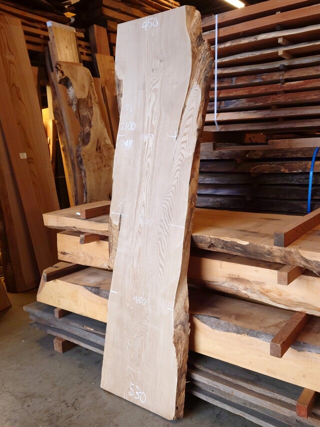 キレイな木目の栗の板です。看板に最適です。【長さ】2100、【木表幅】450~530~530、【木裏幅】490~560、【厚み】45。