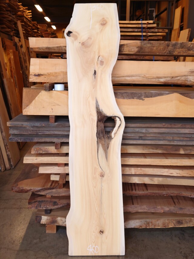 【長さ】2060、【木表幅】260~410~340、【木裏幅】340~460、【厚み】38。