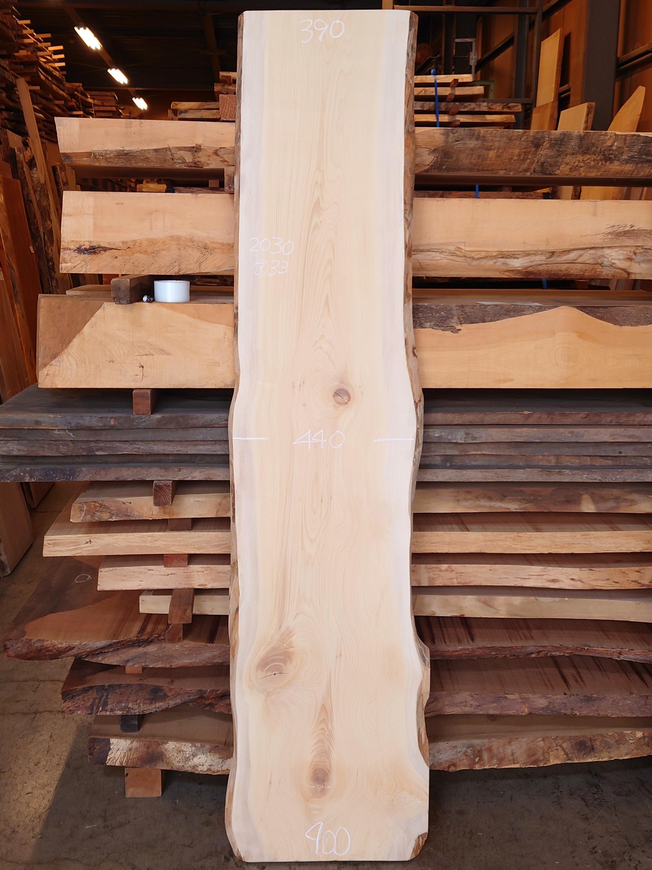 【長さ】2030、【木表幅】390~440~400、【木裏幅】430~450、【厚み】33。