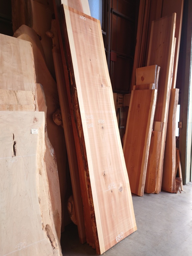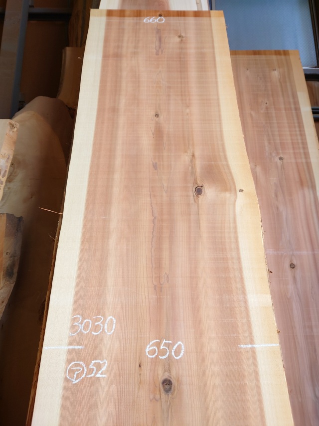 【長さ】3030、【木表幅】660~650~680、【木裏幅】690~720、【厚み】52。