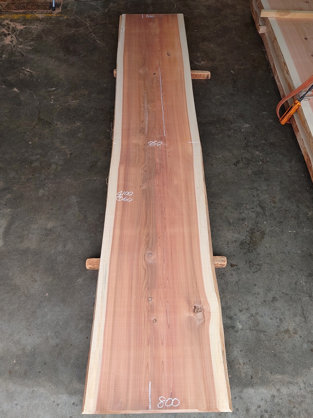 【長さ】4100、【木表幅】700~750~800、【木裏幅】730~840、【厚み】60。