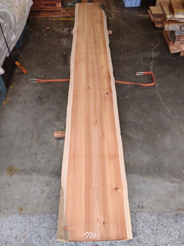 キレイな木目の杉の長尺カウンター天板用の厚板です。カウンターに最適です。 【長さ】5300、【木表幅】540~620~660、【木裏幅】690~770、【厚み】87 【天然乾燥材】、【反り】ほとんどなし、【節】小さい節あり、【割れ】あり(白チョーク)。端部厚みの少し薄い部分がございます。耳は一部加工で作っております。 仕上げ加工前ですので表面ザラザラの状態です。詳細画像や詳細寸法がご希望の場合、また表面仕上げ加工をご希望の場合はお問い合わせよりご連絡いただけましたらお見積りさせていただきます。 長尺材になりますので配送料が別途掛かります。個人宅または現場への配送はできない場合がございますので前もってご相談くださいませ。