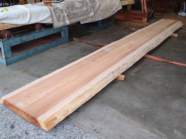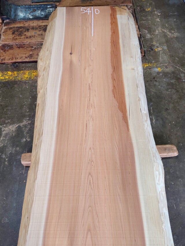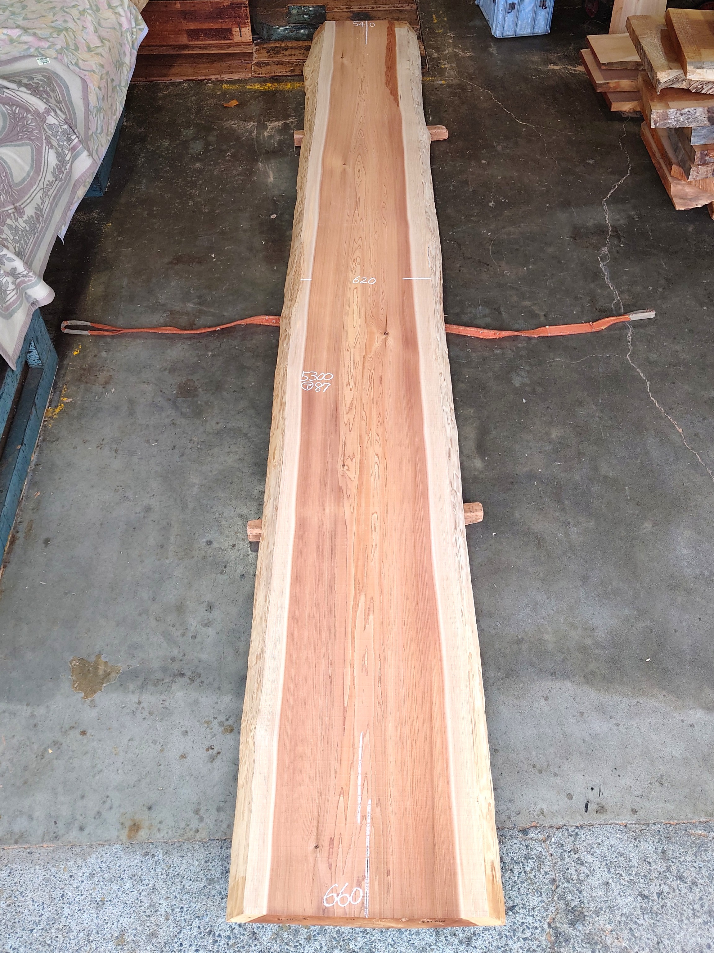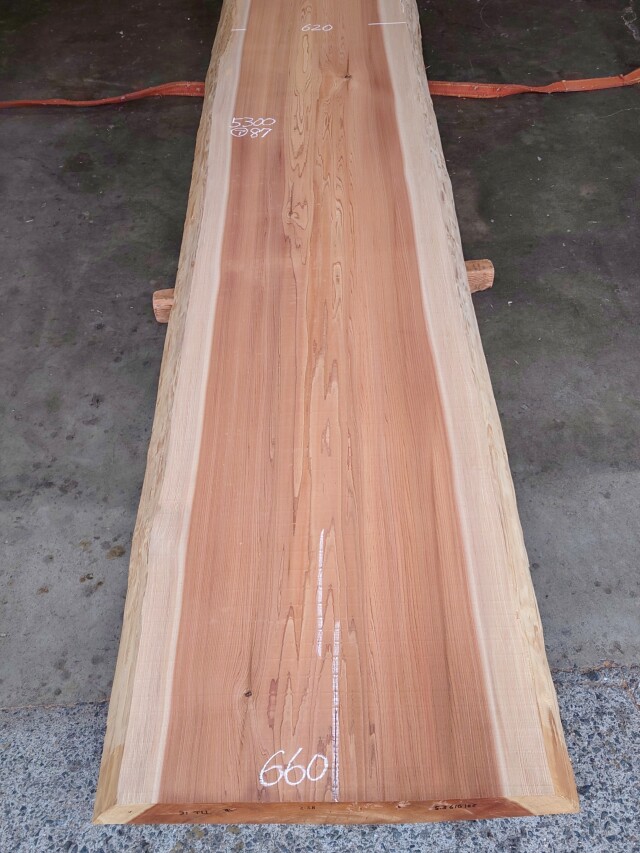 【長さ】5300、【木表幅】540~620~660、【木裏幅】690~770、【厚み】87。