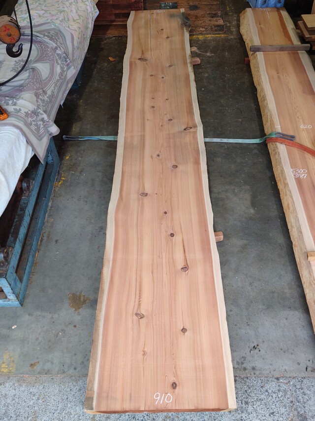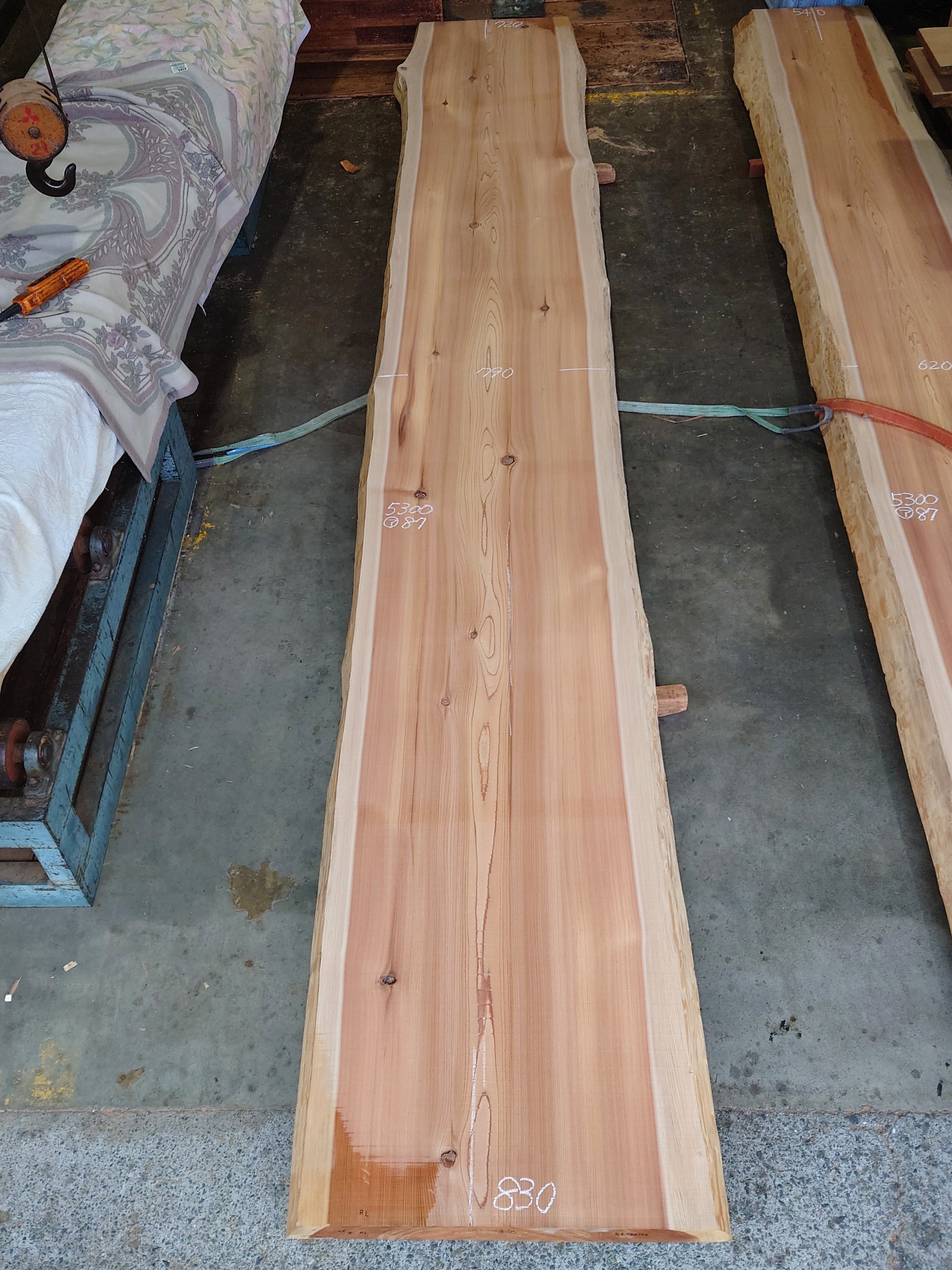 【長さ】5300、【木表幅】720~790~830、【木裏幅】780~910、【厚み】87。