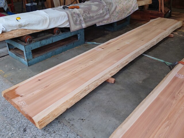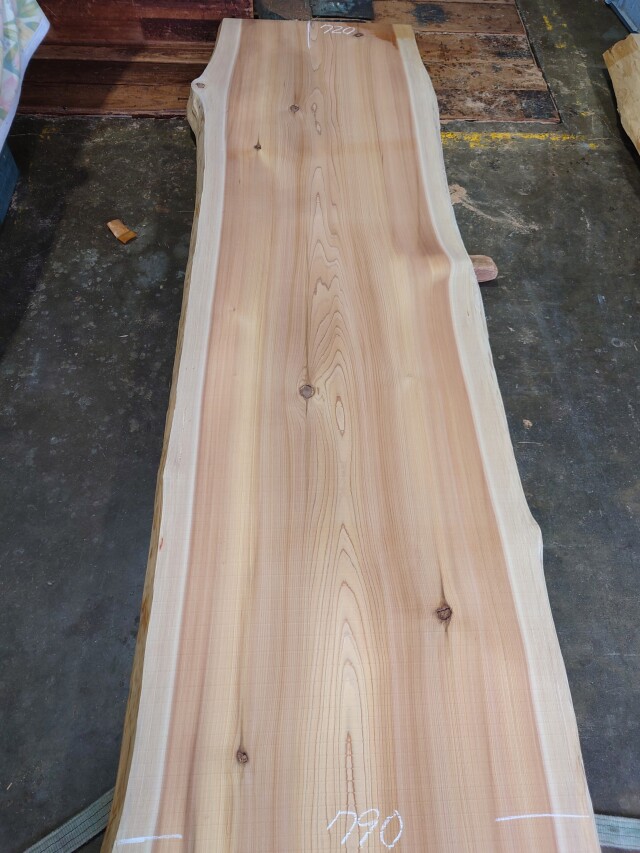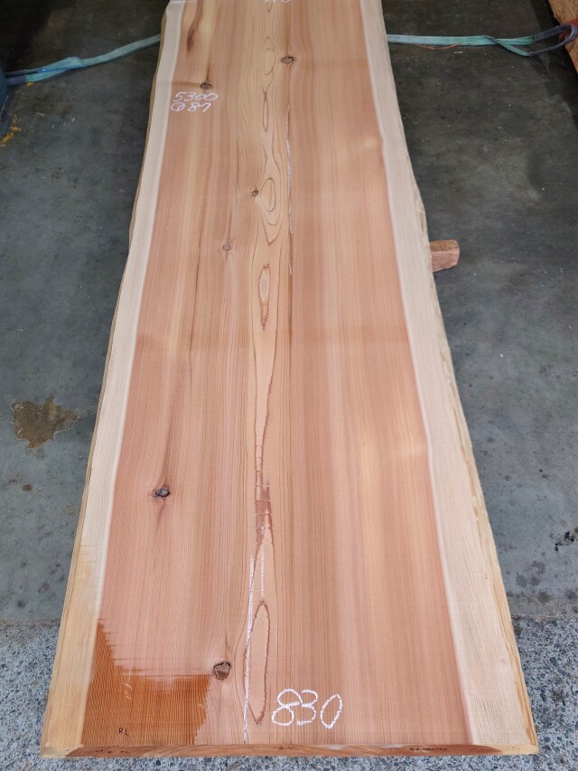 キレイな木目の杉の長尺カウンター天板用の厚板です。カウンターに最適です。<br> 【長さ】5300、【木表幅】720~790~830、【木裏幅】780~910、【厚み】87。 【天然乾燥材】、【反り】ほとんどなし、【節】小さい節あり、【割れ】あり(白チョーク)。端部厚みの少し薄い部分がございます。耳は一部加工で作っております。 仕上げ加工前ですので表面ザラザラの状態です。詳細画像や詳細寸法がご希望の場合、また表面仕上げ加工をご希望の場合はお問い合わせよりご連絡いただけましたらお見積りさせていただきます。 長尺材になりますので配送料が別途掛かります。個人宅または現場への配送はできない場合がございますので前もってご相談くださいませ。