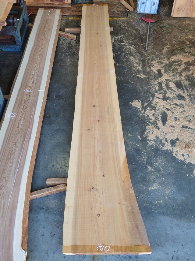 キレイな木目の杉の長尺カウンター天板用の厚板です。カウンターに最適です。<br> 【長さ】4850、【木表幅】430~450~680、【木裏幅】510~680、【厚み】55。 【天然乾燥材】、【反り】ほとんどなし、【節】なし、【割れ】あり(白チョーク)。端部厚みの少し薄い部分がございます。 仕上げ加工前ですので表面ザラザラの状態です。詳細画像や詳細寸法がご希望の場合、また表面仕上げ加工をご希望の場合はお問い合わせよりご連絡いただけましたらお見積りさせていただきます。 長尺材になりますので配送料が別途掛かります。個人宅または現場への配送はできない場合がございますので前もってご相談くださいませ。