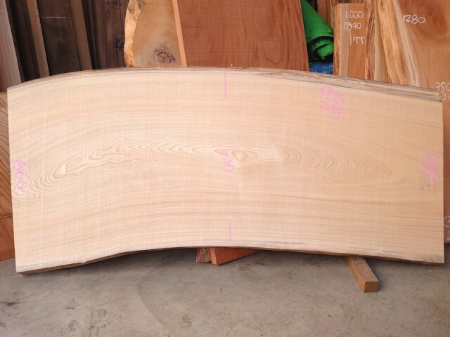 キレイな木目の両耳付きセンノキです。テーブルや看板に最適です。 長さ1520、木表幅580~660、木裏幅650~700、厚み47。 天然乾燥材、節なし(裏面にあり)、割れなし、反りなし。オモテ面裏面とも仕上げ加工前ですのでザラザラの状態です。 詳細画像や詳細寸法がご希望の場合、また表面仕上げ加工やテーブル、看板製作をご希望の場合はお問い合わせよりご連絡いただけましたらお見積りさせていただきます。