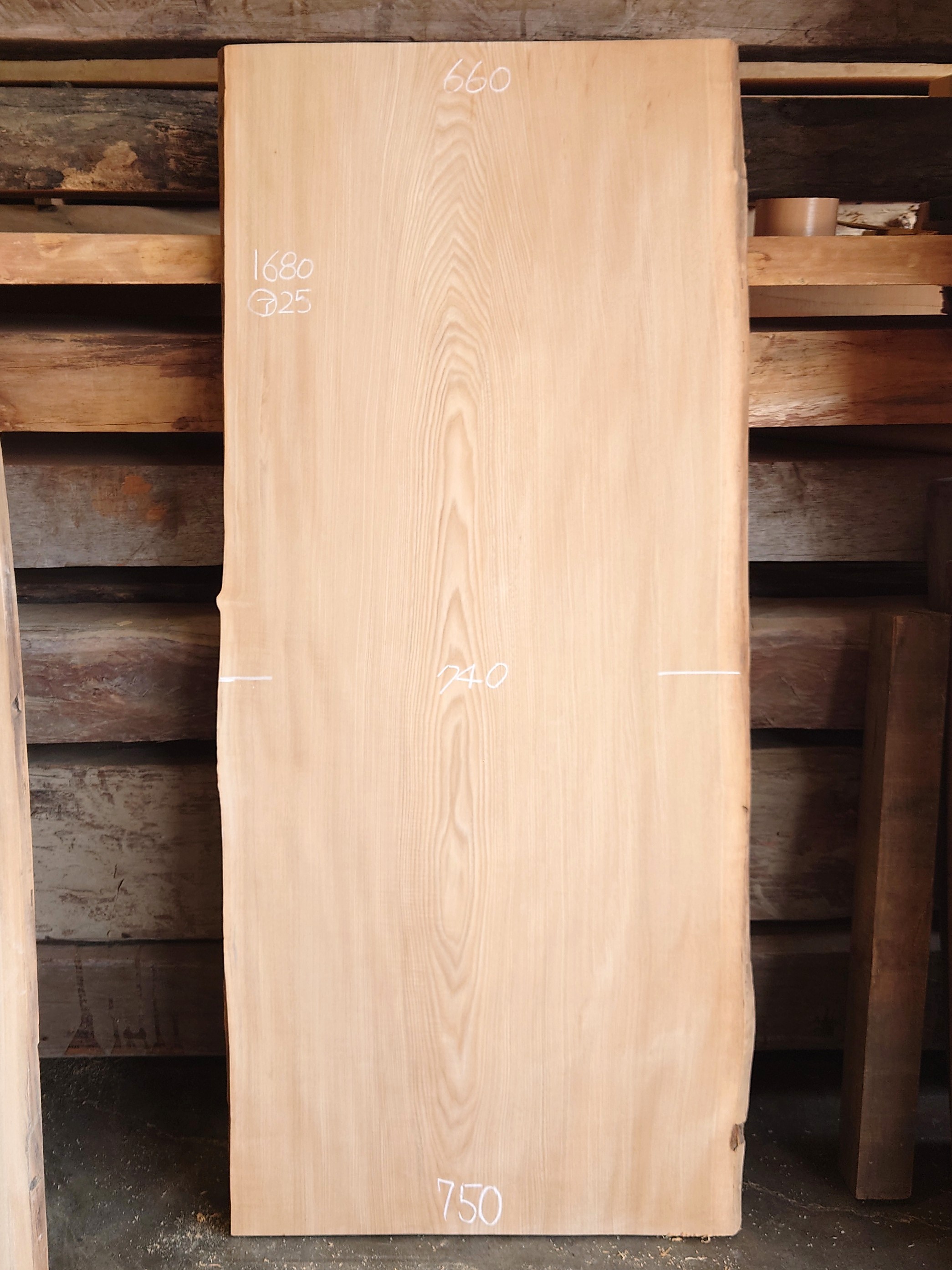 キレイな木目の両耳付き白木の北海道産センノキです。【仕上げ加工済】ですので看板などにはすぐにお使いいただけます。【長さ】1680、【木表幅】660~740~750、【木裏幅】690~770、【厚み】25。