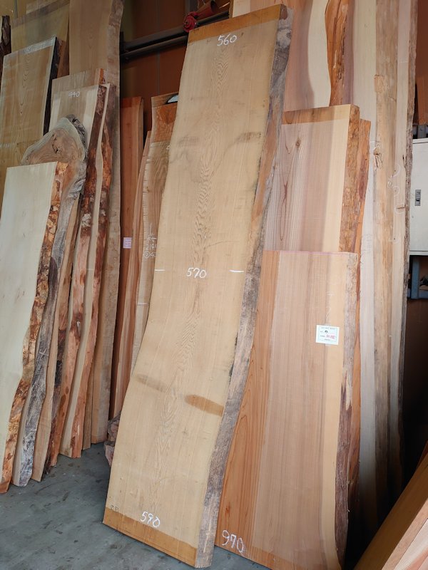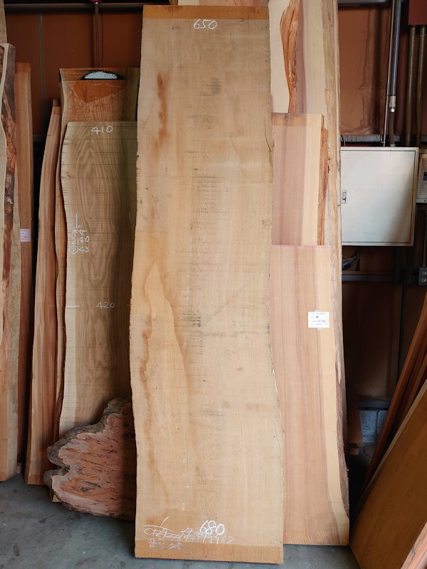 キレイな木目の両耳付きタモです。看板やカウンターに最適です。長さ2340、木表幅560~570~590、木裏幅650~680、厚み67。