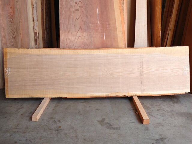 キレイな木目の両耳付きタモです。看板やカウンターに最適です。長さ2050、木表幅420~440~500、木裏幅500~560、厚み48。